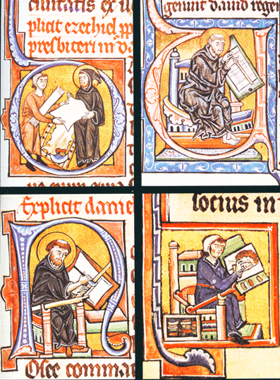 Deze initialen uit het midden van de 13de eeuw tonen enkele scènes uit het 'boekproces'.