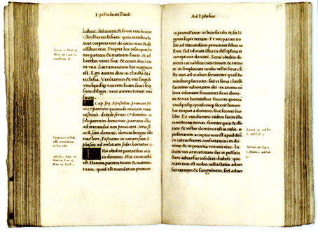 Gedrukte tekst uit de 15de eeuw MS 186 fol 21r, The Rector and Fellows of Exeter College, Oxford |